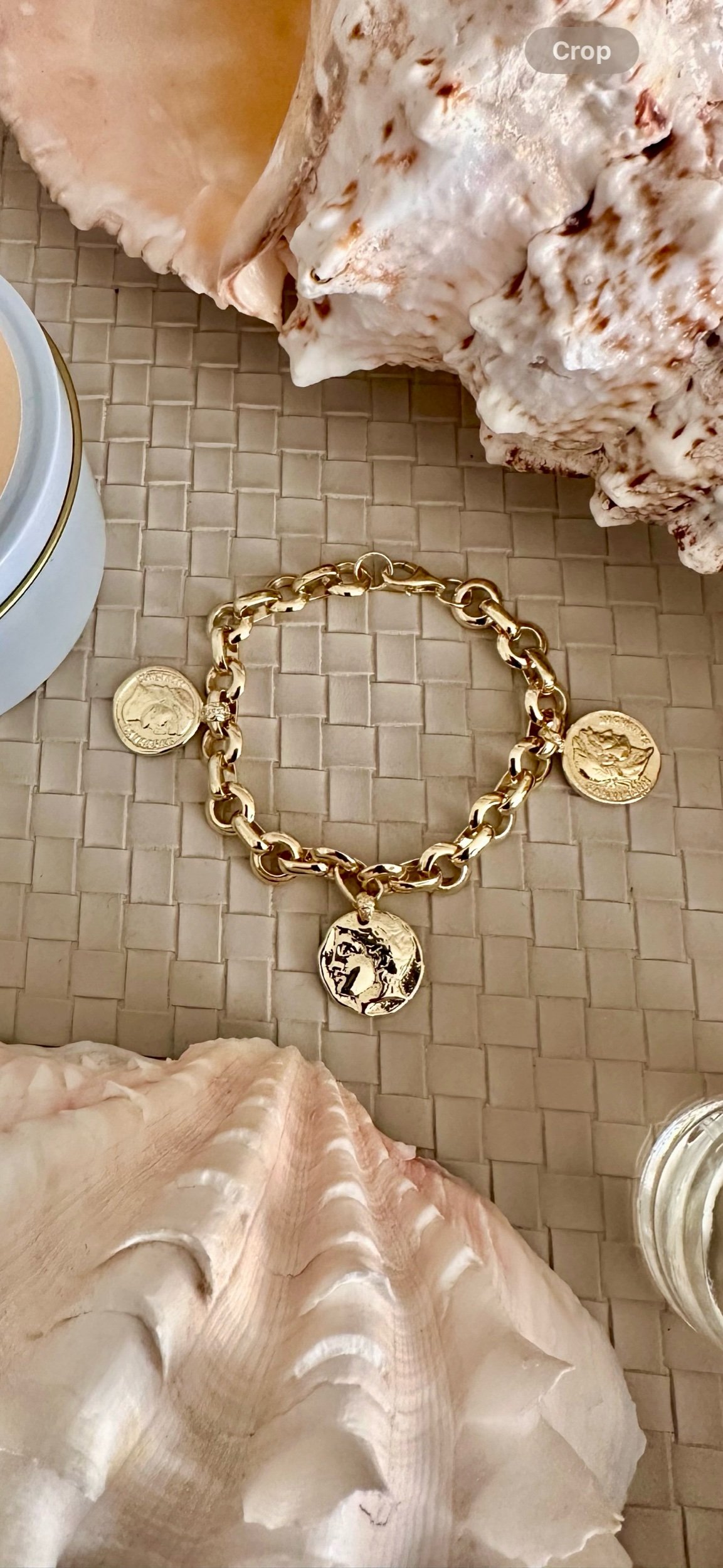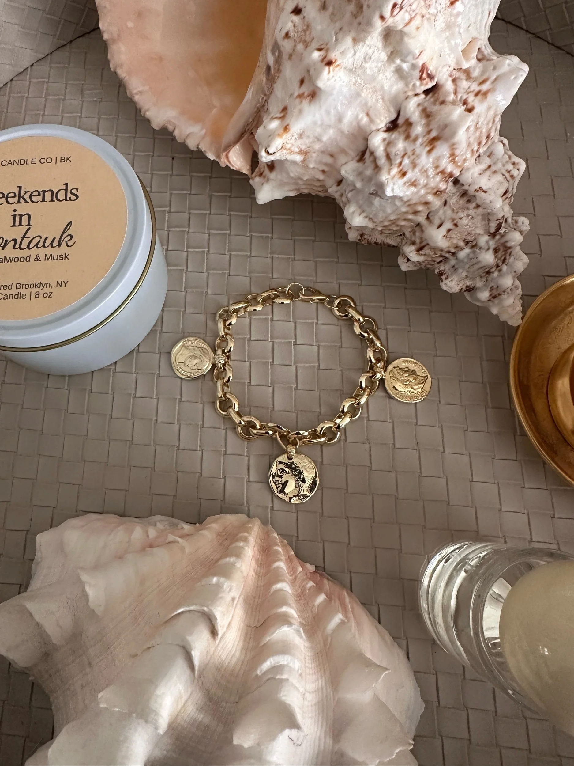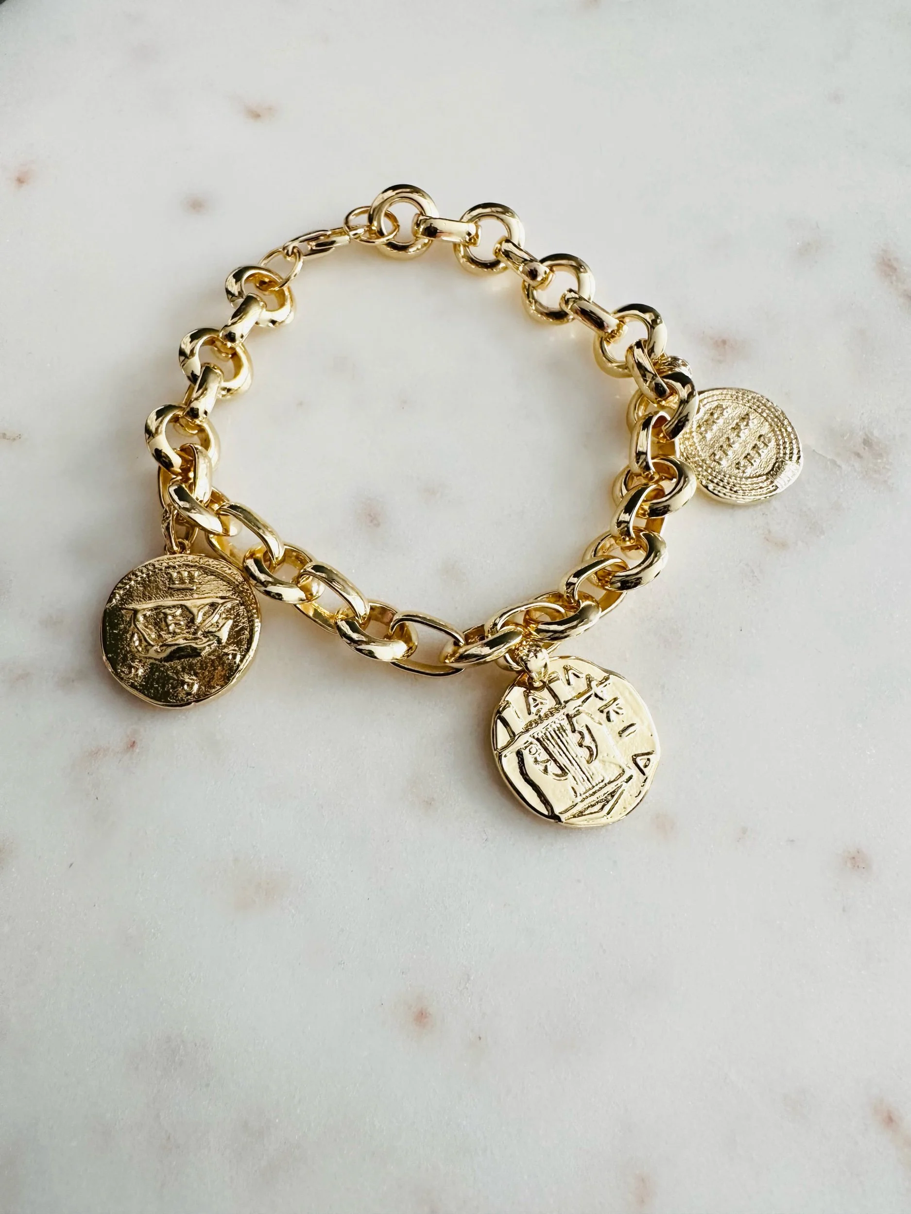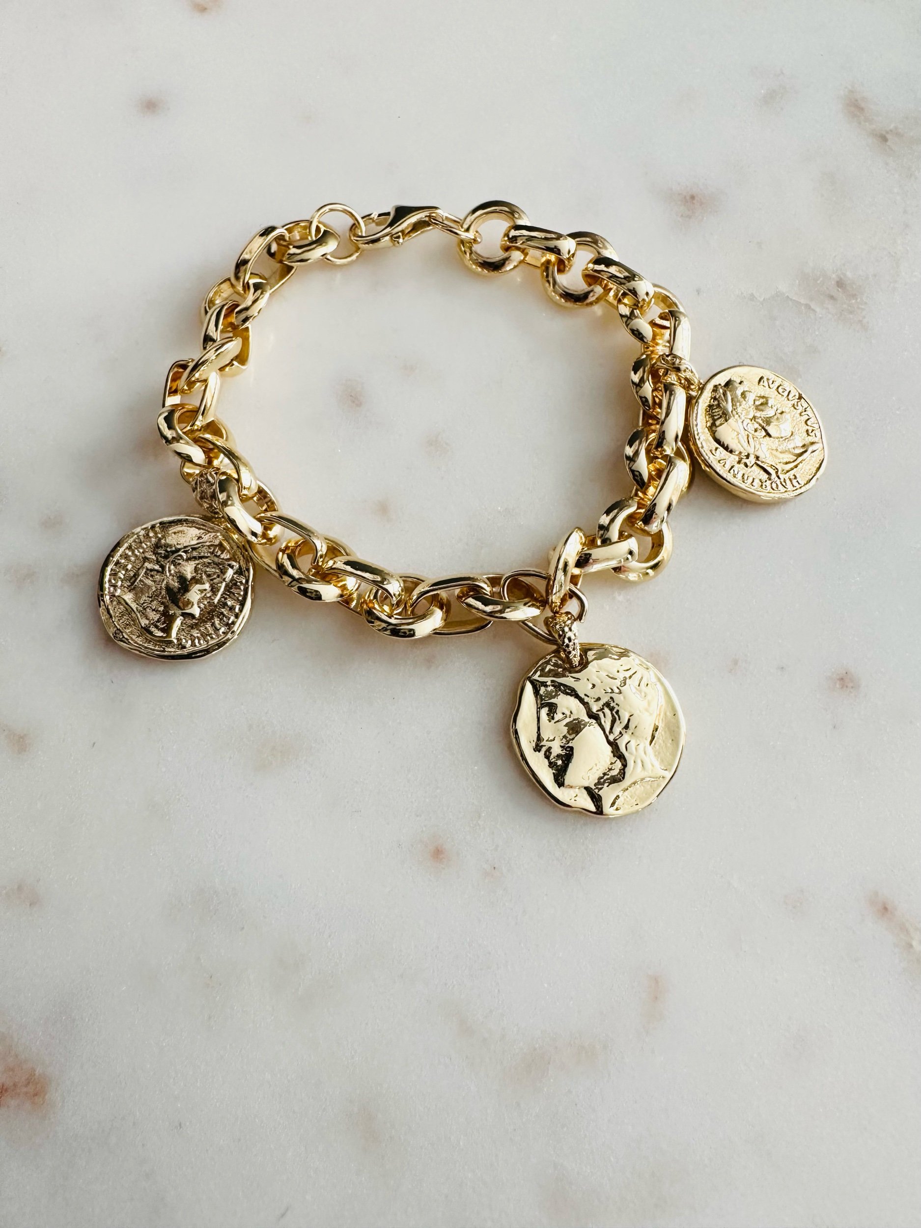 Trio of double sides Roman coins on an oversized rolo stadium chain bracelet