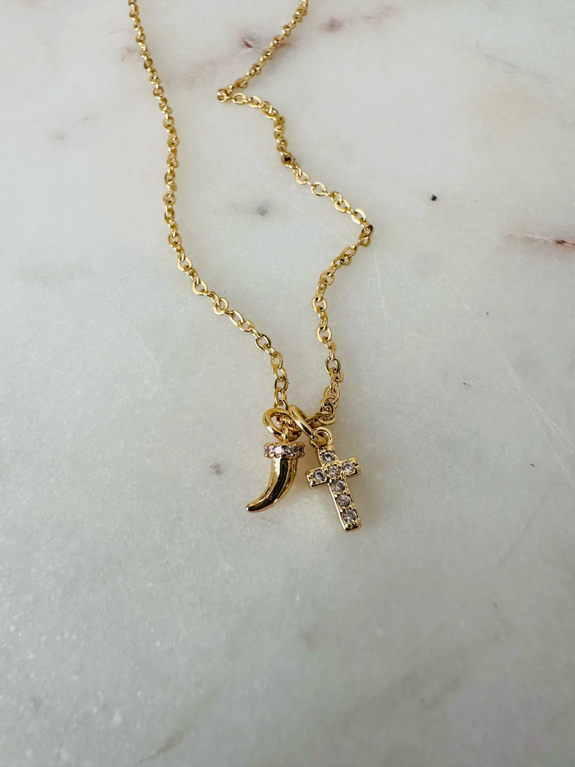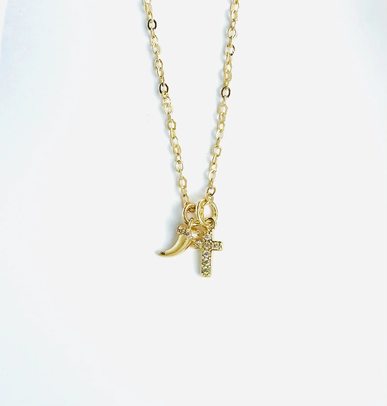 Mini pave cubic zirconia cross and tiny horn on 17-19 inch adjustable rolo chain